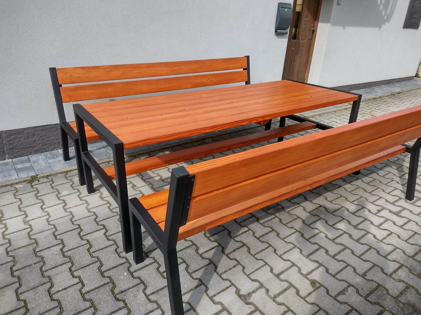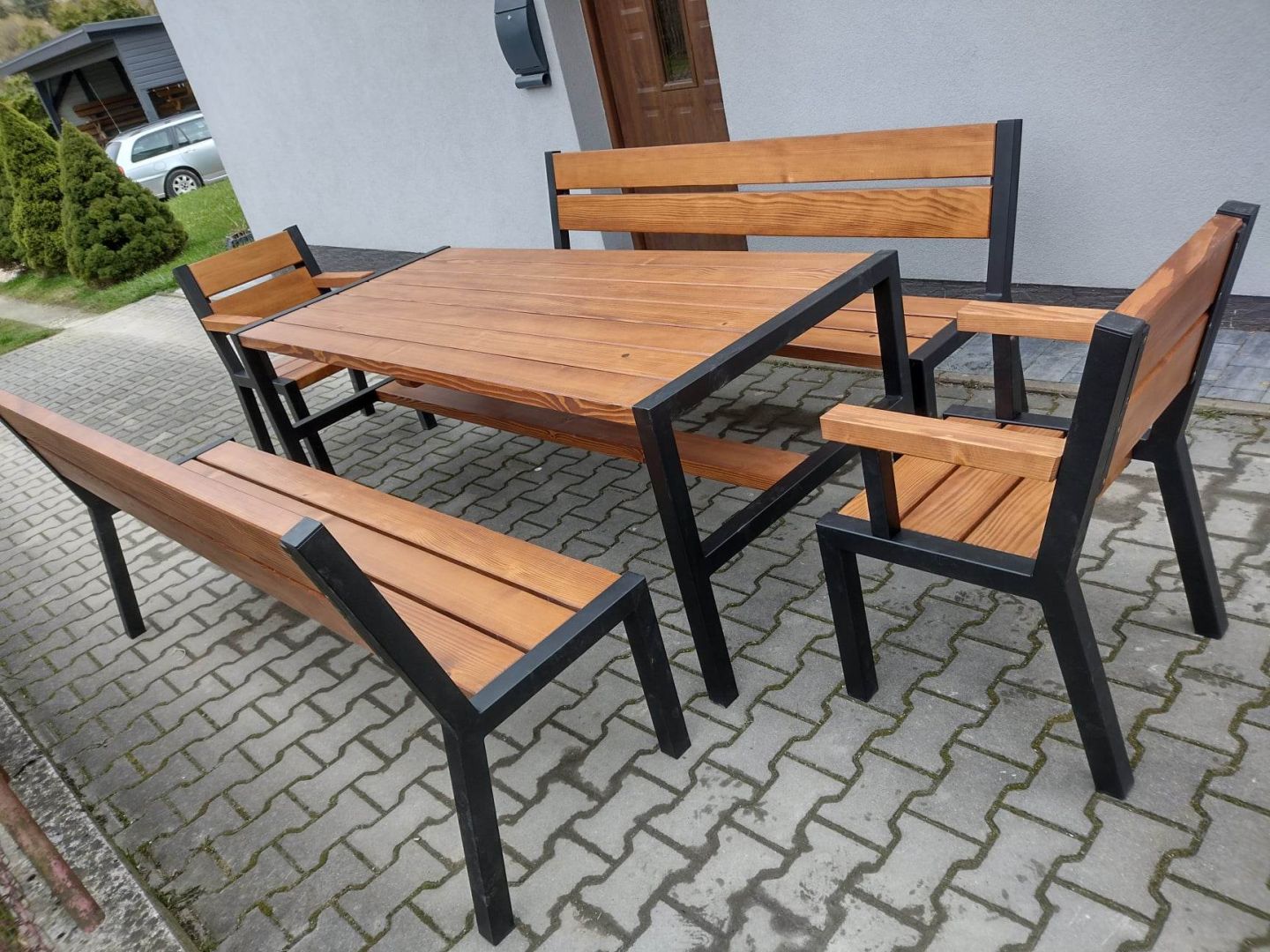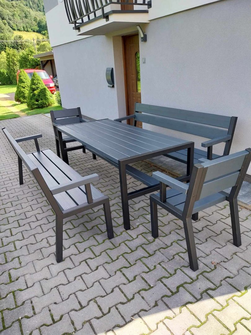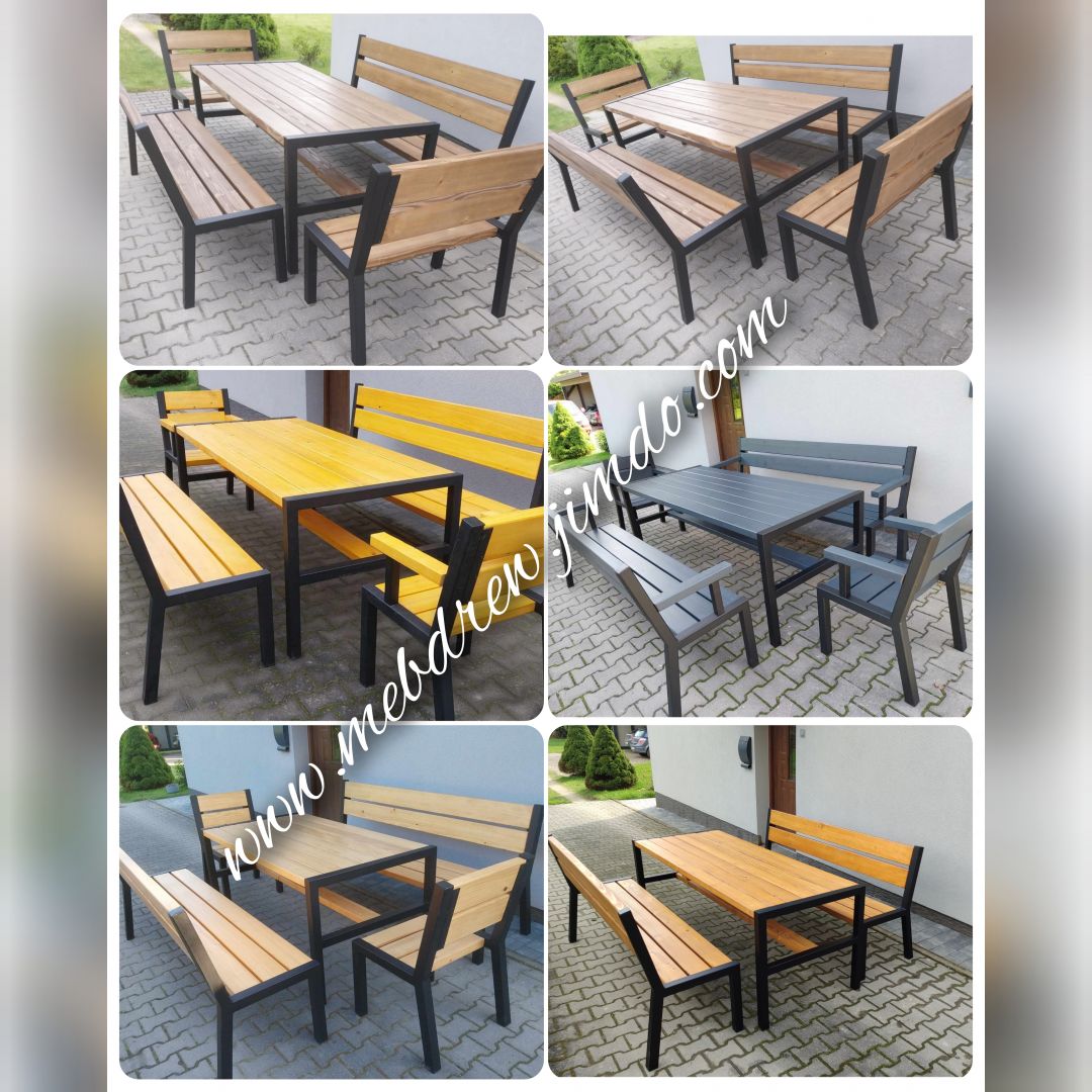 Stół drewniany + metal meble ogrodowe zestaw 2 ławki 2 fotele loft Tokarnia - Zdjęcie 1
